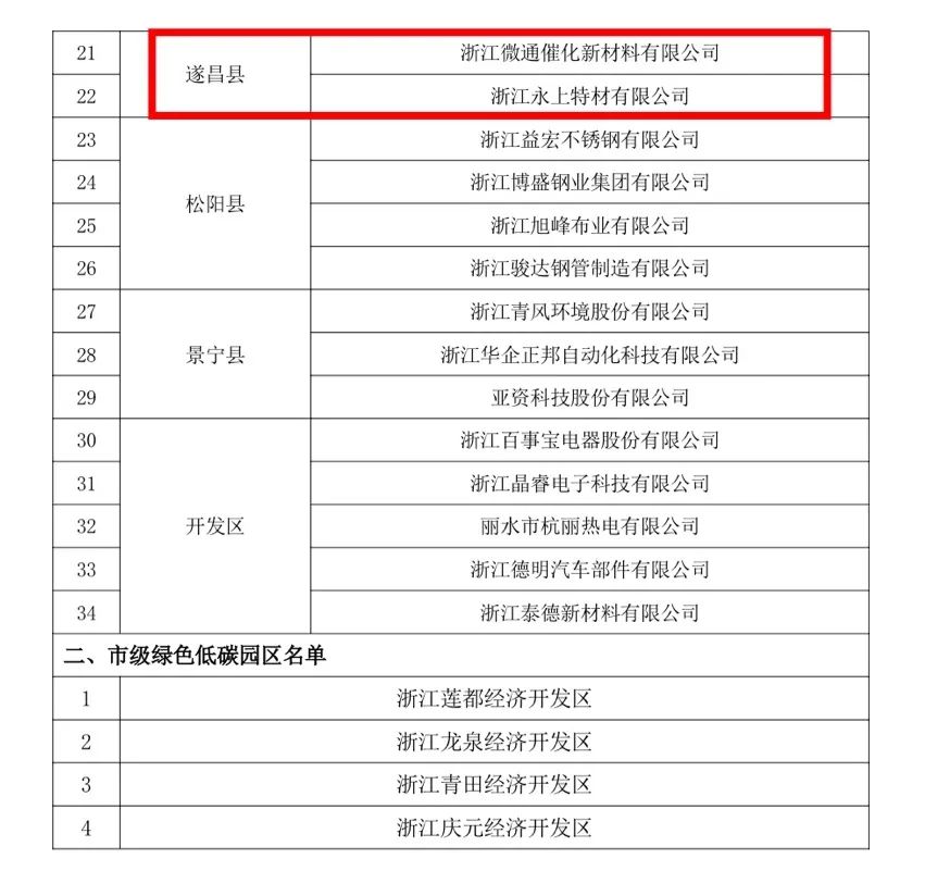 近日,麗水市經(jīng)濟(jì)和信息化局公布了 2023 年市級(jí)綠色低碳工廠(chǎng)和綠色低碳園區(qū)名單,其中,位于遂昌縣的浙江微通催化新材料有限公司、浙江永上特材有限公司2家企業(yè)榜上有名,被認(rèn)定為市級(jí)綠色低碳工廠(chǎng)。
